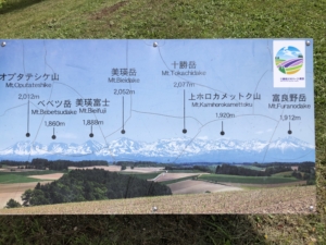三愛の丘展望公園 波状丘陵地帯をのぞく事のできる公園で大雪山から十勝岳連峰を望むことができました。 公園内には東屋、トイレがあり、レンタサイクルで訪れる方にも大人気の場所との事でした。