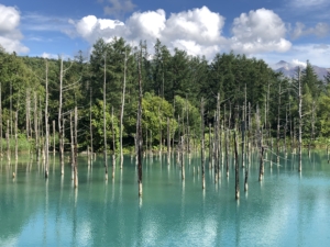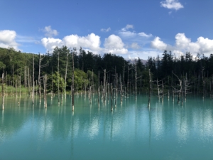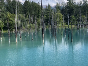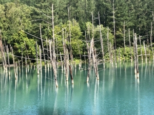 白金青い池 十勝岳の防災工事の際に偶然堰提に溜まった水が不思議なほど青い色(コバルトブルー)になり、立ち枯れたカラマツとあいまって幻想的風景になっている池。 この日はお盆とあって駐車場は満杯で池の周りには沢山の観光客で埋め尽くされていました。