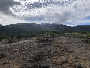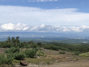 望岳台 標高930mの十勝岳望岳台は、大雪山国立公園十勝岳本峰の真下にあり、大雪山の主峰旭岳を始め美瑛岳、美瑛富士、神富良野岳などが手に取るように見えました。 眼下には旭川市から富良野市までの360度が見え夏は登山基地となっており、この日も沢山の登山者が頂上に向かった登っていました。