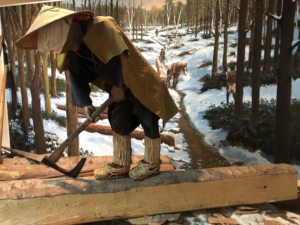 十勝岳の噴火による犠牲者の数の数珠丸と当時の木材加工の様子を人形で表現してました。