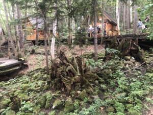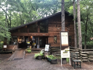 木くずが敷かれている小道を下ると森の時計(カフェ)とSoh’s BARがありました。