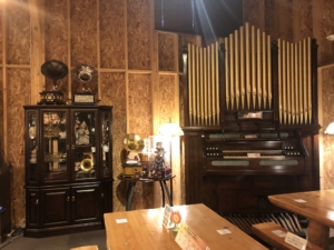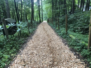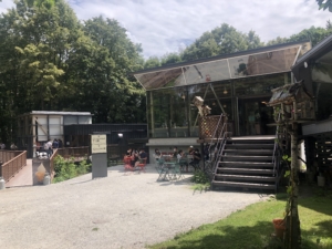 木くずが敷かれている小道を下ると森の時計(カフェ)とSoh’s BARがありました。