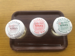 ニッカ会館の二階にある試飲会場 スーパーニッカ、アップルワイン、シングルモルツの3種類の試飲ができました。