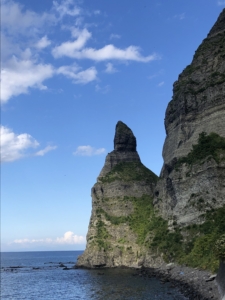 奇岩ローソク岩 海に建つその姿から名付けられた、ニセコ積丹小樽海岸国定公園の中でも有数の奇岩。 海上43m、滝ノ潤ノ岬の先に立ち道行く人々の目を引いています。 5月上旬の朝日をバックにしたまるでローソクの先に火が灯ったような景色はとても美しいそうです。