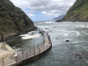 この日は風が強く女人禁制の門は封鎖されていました。 現在は男女ともに通行でき、女人禁制の門から先端までは、両側に日本海の雄大な眺めが広がる遊歩道「チャレンカの小道」を進むとダイナミックな大海原の丸みを帯びた水平線を見ることができるとの事でした。
