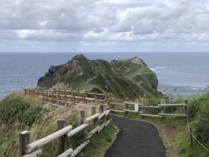 昨日は晴れたり曇ったり、また夕方にはスコール⛈️⛈️⛈️みたいな大雨が降ったりでキャンプ🏕️🏕️🏕️に来ている人達はテントが風に飛ばされない様に、ずぶ濡れになりながら大忙しそうでした。 私達のいる駐車場も20台程度で満杯、キャンプをしている家族や友達同士のテントも15張程ありましたが、雨が降ったり、風が吹いたりしても皆さんとても楽しそうでした。 朝9時過ぎると帰る準備を始めるチームもあり、その様子を見ているとテントをかたずけ、ゴミを回収、そして原状復帰をしてから出発していました。 殆どのキャンパーはマナーを守って行っているのに極一部の方の為に色々言われているのが残念ですね~😅😅😅。 それでは私達も出発🚍💨 最初の観光地・神威岬(かむいみさき)に到着。 台風みたいな強風が吹いており、看板にも強風につきドア開放時注意と書いてありました。 地形状強風が吹く場所とのことでした。