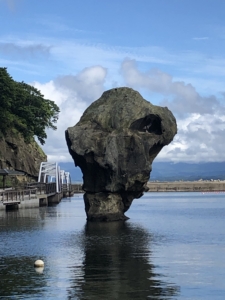 瓶子岩 かつてニシン漁が盛んだった江差に伝わる「折居伝説」のなかに出てくるのが、この「瓶子岩」。 かもめ島に入ったらすぐに真っ赤な鳥居と共に見えます。 祭りの時にはふんどし姿の男性が数人この岩に上っている様子を写真でみました。
