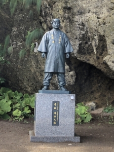 江差追分の功労者の銅像 独特の哀愁を帯びた江差追分は、ニシン交易の船乗りたちによって信州から伝わったとされています。 足元のボタンを押すと、江差追分の歌が流れてきます。