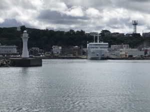 江差港から奥尻島に向かうフェリーと紅白の灯台