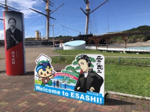 昨夜の雨も上がりいい天気🌞🌞🌞になりました。 暗くて雨が強くて分かりませんでしたが駐車した近くに面白い自作ぼい人形の銅像がありました。 説明文を読んでみると江戸時代に江差に実在していた、とんちと笑いを振りまいた繁次郎さんの像との事でした。 台座には「笑え、わらえば ええことあるで」と書いてありました😄😄😄。 朝食も済ませ近くのかもめ島へ向かいます🚍💨。