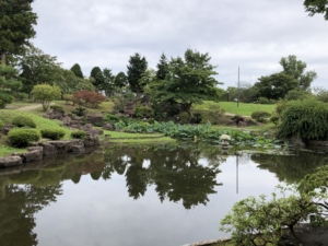 松前藩屋敷に隣接する日本庭園 広さ1万7千平方mの広大な敷地に、小川や滝池、散策路、東屋などがもうけられていました。
