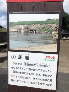 源義経の北行伝説の馬岩 頼朝に追われ江差にきた義経が、再び江差を離れる際、どうしても船に乗せる事ができず、別れを惜しんで残した愛馬が白い岩になったと言う伝説