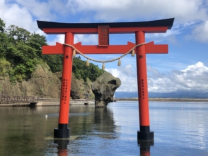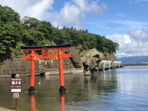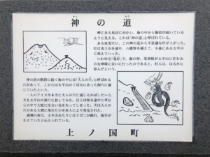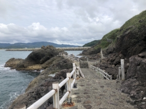 神の道 大潤ノ崎にある窓岩の上から階段の様になっているいることが由来で、この神の道は海の神「龍神」が大平山の山の女神に逢いに、「龍燈」となって八幡牧野を通て行くという「龍神伝説」があります。 「龍神伝説」から神の道は恋愛のパワースポットと言われています。