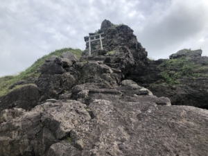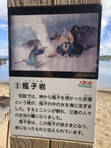 瓶子岩 かつてニシン漁が盛んだった江差に伝わる「折居伝説」のなかに出てくるのが、この「瓶子岩」。 かもめ島に入ったらすぐに真っ赤な鳥居と共に見えます。 祭りの時にはふんどし姿の男性が数人この岩に上っている様子を写真でみました。