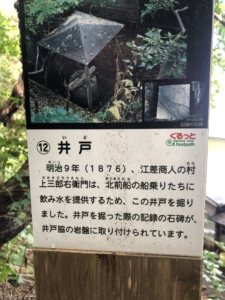 松前船飲用井戸 かもめ島へのふねの出入りが多くなると、船乗りたちは水の確保に苦労しました。 島には水が無く、そこで1876年(明治9年)に莫大な私財を投じて造ったのが、江差の問屋であった村上三郎左右ェ門でした。「松前船飲用井戸」は現在、町指定の文化財に指定されています。