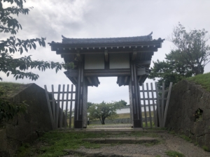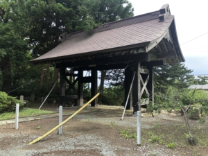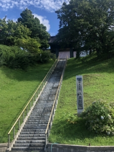 城の山側を守るように配置された15の寺院からなる寺町は、明治維新の戦乱でそのほとんどがが焼失し、現在5つの寺のみが残っているそうです。 その寺の門が倒れないようにワイヤーロープで四つ角を支えていました。