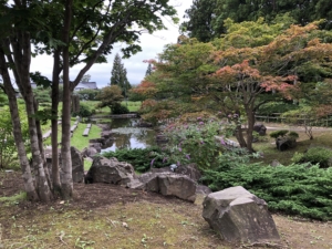 松前藩屋敷に隣接する日本庭園 広さ1万7千平方mの広大な敷地に、小川や滝池、散策路、東屋などがもうけられていました。