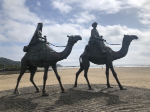 勝浦市に向かう途中、月の砂漠公園の看板が見えたので入ってみました。 小さい頃に学校で習った歌「月🌙の砂漠を はるばると 旅のらくだ🐪がゆきました 金と銀との くらおいて 二つならんで ゆきました」 子供の頃なんとロマンチックな響きの歌だな~と思った歌・うたの場所でした。 本当に感激で~す😍😍😍 まさかこの地・御宿の海岸がモデルとは・・・! 車を駐車して砂浜を歩いていくと🐪のモニュメントがありました。