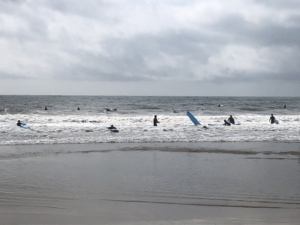 海を見ると何百人ものサーファーが波乗りに乗じていました。