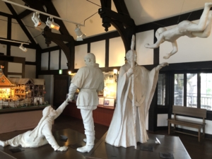 シェイクスピアのミニ展示室 彼の作品を再現した人形が置かれていました。 「真夏の夜の夢」3幕1場、「テンペスト」1幕2場、「ハムレット」3幕1場などの人形と音声でリアルに演出していました。