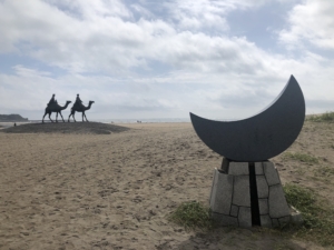 勝浦市に向かう途中、月の砂漠公園の看板が見えたので入ってみました。 小さい頃に学校で習った歌「月🌙の砂漠を はるばると 旅のらくだ🐪がゆきました 金と銀との くらおいて 二つならんで ゆきました」 子供の頃なんとロマンチックな響きの歌だな~と思った歌・うたの場所でした。 本当に感激で~す😍😍😍 まさかこの地・御宿の海岸がモデルとは・・・! 車を駐車して砂浜を歩いていくと🐪のモニュメントがありました。