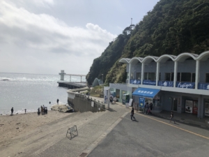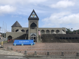 道の駅「鴨川オーシャンパーク」 扇形のユニークな三階建ての施設では太平洋を見ながら新鮮な魚介類を食べることができます。