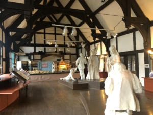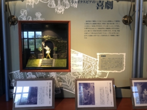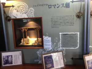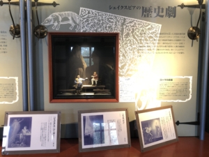 シェイクスピアのミニ展示室 彼の作品を再現した人形が置かれていました。 「真夏の夜の夢」3幕1場、「テンペスト」1幕2場、「ハムレット」3幕1場などの人形と音声でリアルに演出していました。