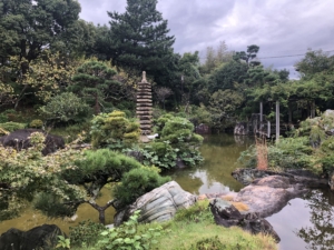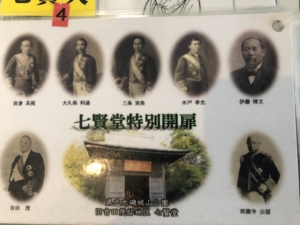 七賢堂と日本庭園 七賢堂は明治36年(1903)に伊藤博文が、明治維新の元勲のうちの岩倉具視・大久保利光・三条実美・木戸孝允の4人を祀ったものでその後、伊藤博文・西園寺公望・吉田茂が加わり七賢堂となったそうです。