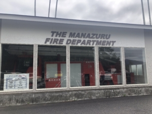 THE MANAZURU FIRE DEPARTMENT 石原軍団寄贈の消防車がガラス張りの倉庫の中に有りました。