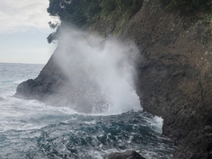 朝食後、海岸線にを通る県道109号線を南下。 グーグルマップで汐吹岩があるとの事で行って見ました。 期待して行って見ましたが、単に波で浸食した穴に波が入り込んで噴き出ている自然現象でした。