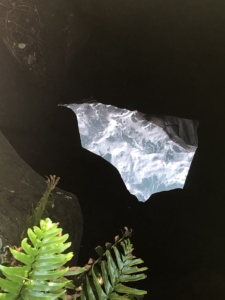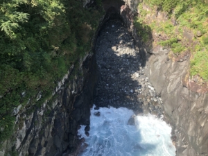 城ケ崎駐車場で昼食後、今度は反対方向の遊歩道ピクニカルコースへ。 ニューヨークランプから吊り橋までの間に穴口があり、上から覗き込むと海面が見えました。