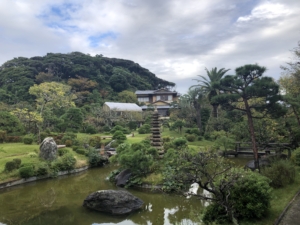 七賢堂と日本庭園 七賢堂は明治36年(1903)に伊藤博文が、明治維新の元勲のうちの岩倉具視・大久保利光・三条実美・木戸孝允の4人を祀ったものでその後、伊藤博文・西園寺公望・吉田茂が加わり七賢堂となったそうです。