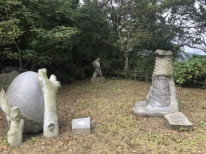 石の広場 いくつかの石の彫刻が置いてある駐車場。