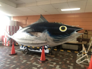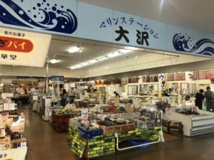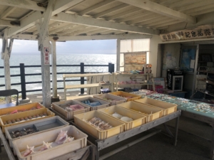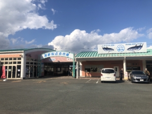 御前崎に手前にあった海鮮なぶら市場 店内の土産物店や鮮魚店には沢山の種類の鮮魚・干物などを威勢よく販売していました。 また隣接したレストラン街ではカツオやマグロの漬け丼などに楽しそうに舌打ちをしていました。