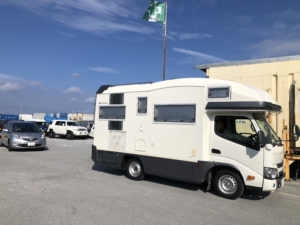 検査員と輸送における問題個所の有無を確認、プルミエGOを引き取り、妻の待っているホテルへ。 歩いて1時間でしたが車では約10分程度で到着、荷物を載せ沖縄の1日が始まりました。 矢張り「自分の家は良いね🥰🥰🥰」と妻と二人で喜び合いました。 沖縄の道も大分わかるようになってナビ無しで走れるようになりました。 国道58号線を一路北上🚍💨💨、取り合えず途中で水と食料の補給をしなければ・・・😅😅😅。  今夜の宿は以前来たことのある夕日がきれいな渡具知ビーチの公園に決定。 嘉手納基地も近いこともあってアメリカ人の家族が沢山遊んでいました。 雨・風が強くなって来たので車内で夕食、暫くぶりの我が家のベットで就寝💤💤💤最高でした
