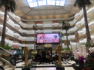 かりゆしビーチリゾート ロビーに入ると昨年無かったオーロラビジョンが付いていらり、JTB・Rakutenラウンジが設けられて豪華になったような気がしました。