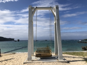 前回もお世話になった恩納村のNABIビーチ。 天候も少し回復し、大阪から来た高校生たちがビーチバレーや海水用を楽しんでいました。 矢張り沖縄は晴れてなくてはね・・・!😃😃😃 昨年無かった丘の上にブランコができていました。 来る度に施設がよくなっていました。