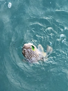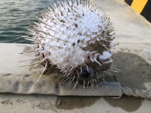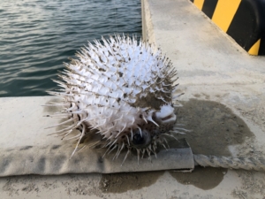 暫くぶりの晴天🌞🌞🌞。 掃除・洗濯を終えて、午後から近くの岸壁で魚釣り🎣🎣🎣~~です。 海中には沢山の魚が泳いでいたのですが、中々食いついてくれなく四苦八苦🙁🙁🙁。 日焼けもしてきたので釣り終了・・と思ったら20㎝位の魚が食いつき揚げてみたら、な・な・なんとハリセンボン。 あわてて車に携帯を取りに行って証拠写真を「パッチリ」 観光客も来て珍しそうに写真を撮って帰りました。 ハリセンボンも怒っているのか腹を膨らませ、鳴いていましたので海に返してやりました😅😅😅。   沖縄ではハリセンボンを「アバサー」と呼び 、市場などでは皮を剝がされた状態で良く売られています。 アバサー汁としてポピュラーな家庭料理だそうですが、食べれそうにないですね😅😅😅。