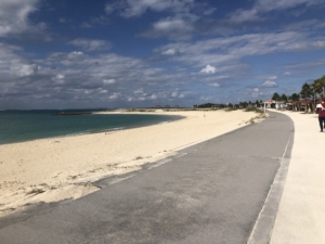 豊崎海浜公園オリオンECO美らSUNビーチ  ショッピングモールから橋を渡ると約700mの美しい人工の砂浜のビーチがありました。 那覇空港からも近く、旅客機🛬の着陸する姿が目の前に見えました。 また子供達の遊具やBBQの設備も揃っていて家族でも楽しめる場所でした。 公園の先には映画「涙そうそう」のロケ地になった「兄ィニィの丘」がありました。