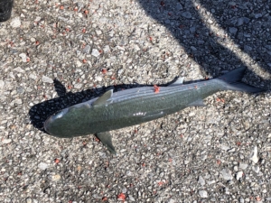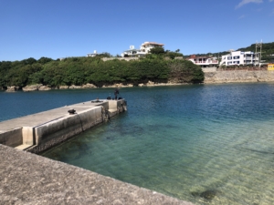 奥武島  奥武橋を渡ると直ぐに中本鮮魚てんぷら店の看板が見えます。 この店も有名とか・沢山の人が並んでいました。 橋の横には沢山の釣り人がいて釣りを楽しんでいました。 釣れた魚はボラとのことでリリースしていました。