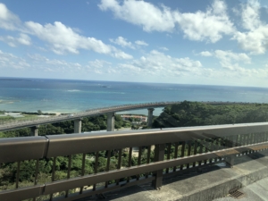 ニライカナイ橋  沖縄の観光パンフレットに載っていた橋。 昨年は走らなかったので今回走行してみました。 海に向かって大きくカーブを描く全長660m、高さ80mの橋。 「ニライカナイ」とは海の向こうにある理想郷という意味とか・・!。