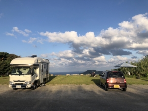 今夜の宿はユインチホテルホテルのご厚意でオートキャンプ場に宿泊する事になりました。 ホテルの高台にあって知念岬が良く見える絶景地での宿泊は最高でした。 一つ残念なことは風が強くて車内での焼肉になってしまった事。 窓を全て前回にして煙が室内に充満しない様にして食べましたが外でのBBQとは雰囲気・味が全く別物でした・・・?!😅😅😅。  隣の芝生で女性2人がBBQをしていましたが薪が足りなく、買い出しに行って火を焚く事ができず寒そうでした・・!。 少し可哀想でした。