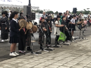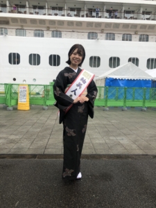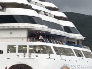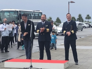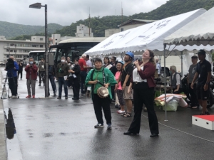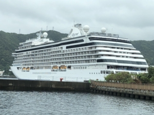 朝小雨の中、私はクルーズ船が入港すると言うのでワクワクしながら待っていました。 遠くに白い船体が見えてくると、どこからとなく沢山の車と人が集まって来て歓迎セレモニーの準備をし始めました。  3年5カ月ぶりの国際クルーズ船が寄港と言う事で島内は大変盛り上がっていました。  このクルーズ船は「セブンシーズ・エクスプローラー」(5万6000トン)。 東京発で神戸や韓国・釜山、長崎などを巡る2週間のツアー、乗船客約650人のほとんどが欧米豪など海外の観光客でした。 歓迎セレモニー後、乗船客はバスやタクシーなどで島内観光に出発しました。