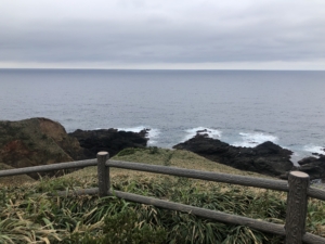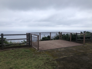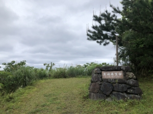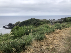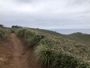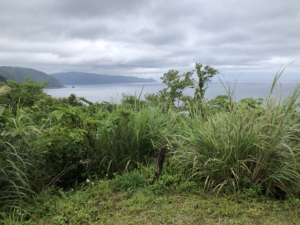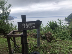 宮古崎 大河ドラマ「西郷どん」のオープニングロケ地。 片道20分の舗装された道を歩くと琉球笹が一面に広がる緑の景色と青い海・・?! 当日は雨が降ったり曇ったりで素晴らしい景色を見る事ができませんでしたが、遠い海にクジラを見る事ができました。