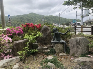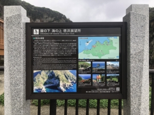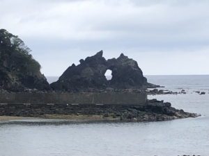 徳浜の断崖 トンネルを抜けた所にあり、荒々しい石山が海に立つ様子は圧巻でした。 今日の宿はこの近くの名音漁港に宿泊、漁師さんや地元の子供たちがプルミエ号を見学に来て車の前で写真を撮っていました。
