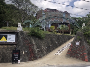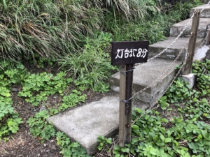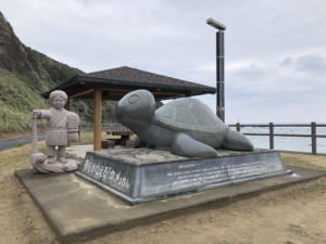 笠利崎観光公園と笠利崎灯台 アヤマル岬から北に約20分程度で到着。 灯台の手前約300mに「夢をかなえるカメさん」がありました。 細いチェーン付手すり階段を注意しながら登ると灯台がありました。