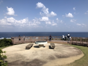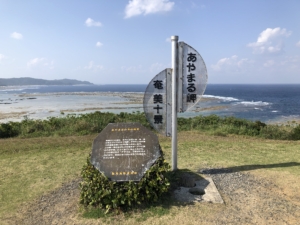 あやまる岬 太平洋に出た岬、この一帯がこんもりとしたなだらかな地形が「アヤに織られた手毬」によく似ていることからアヤマルと呼ばれ奄美の十景の一つです。
